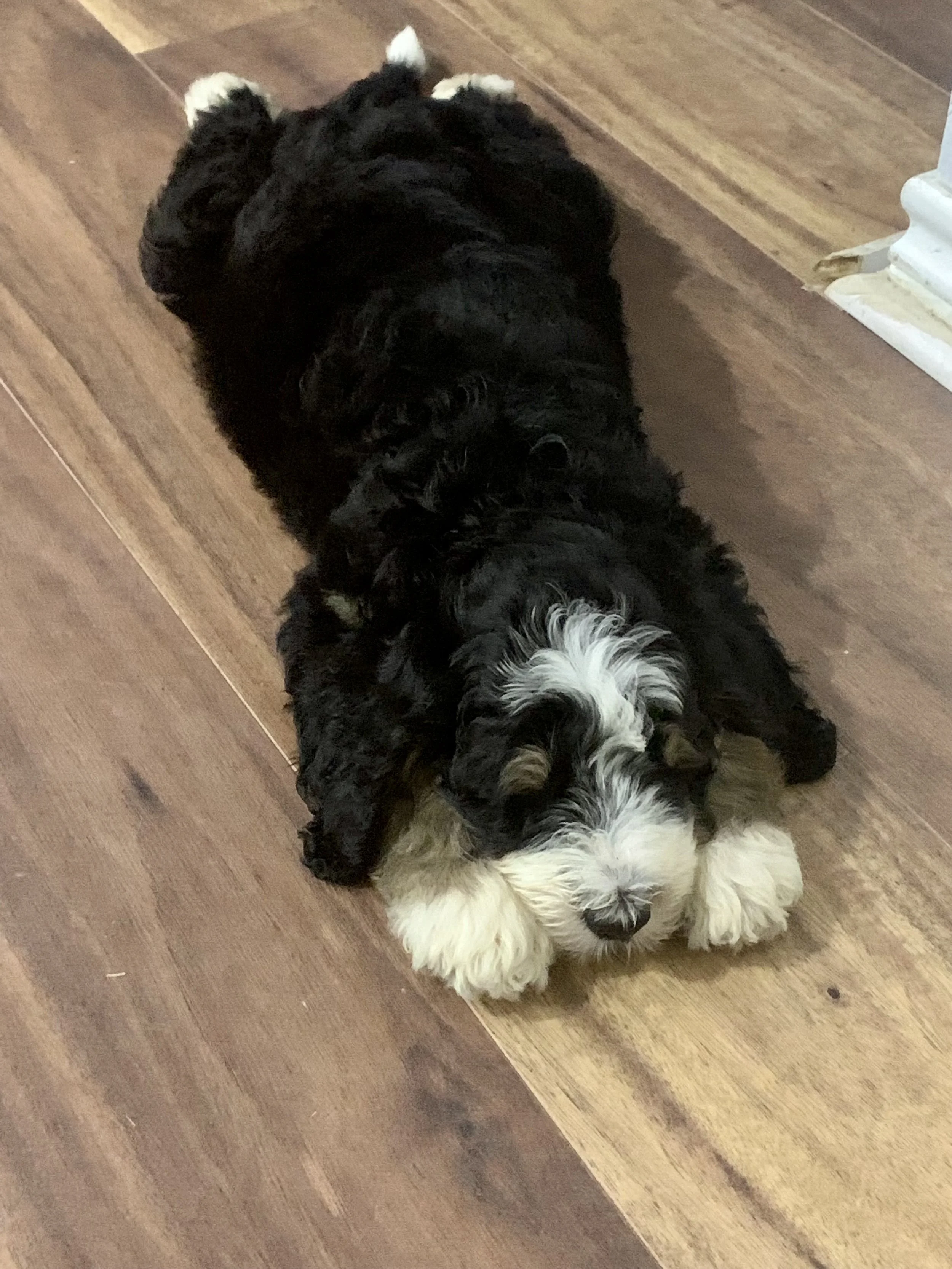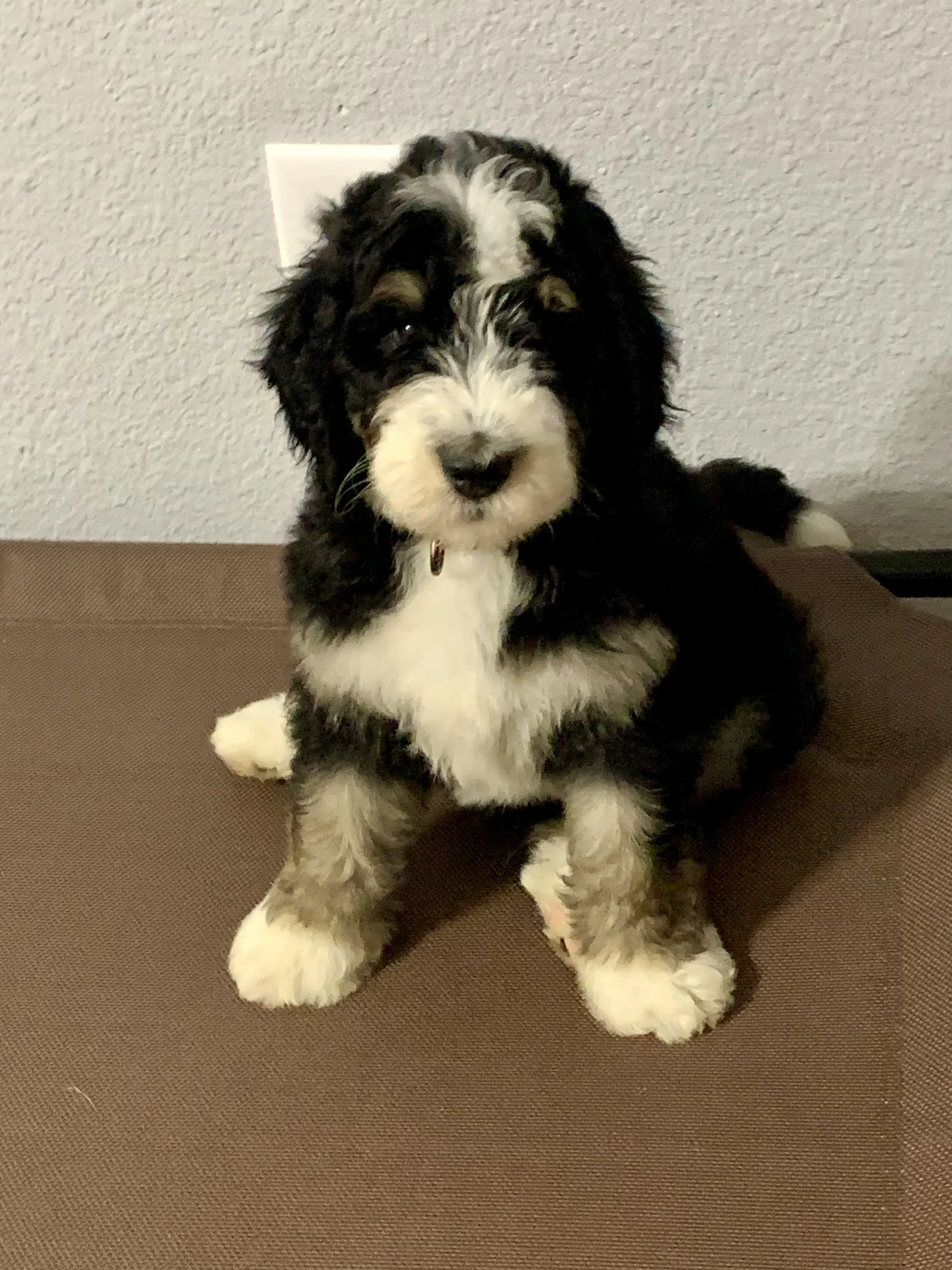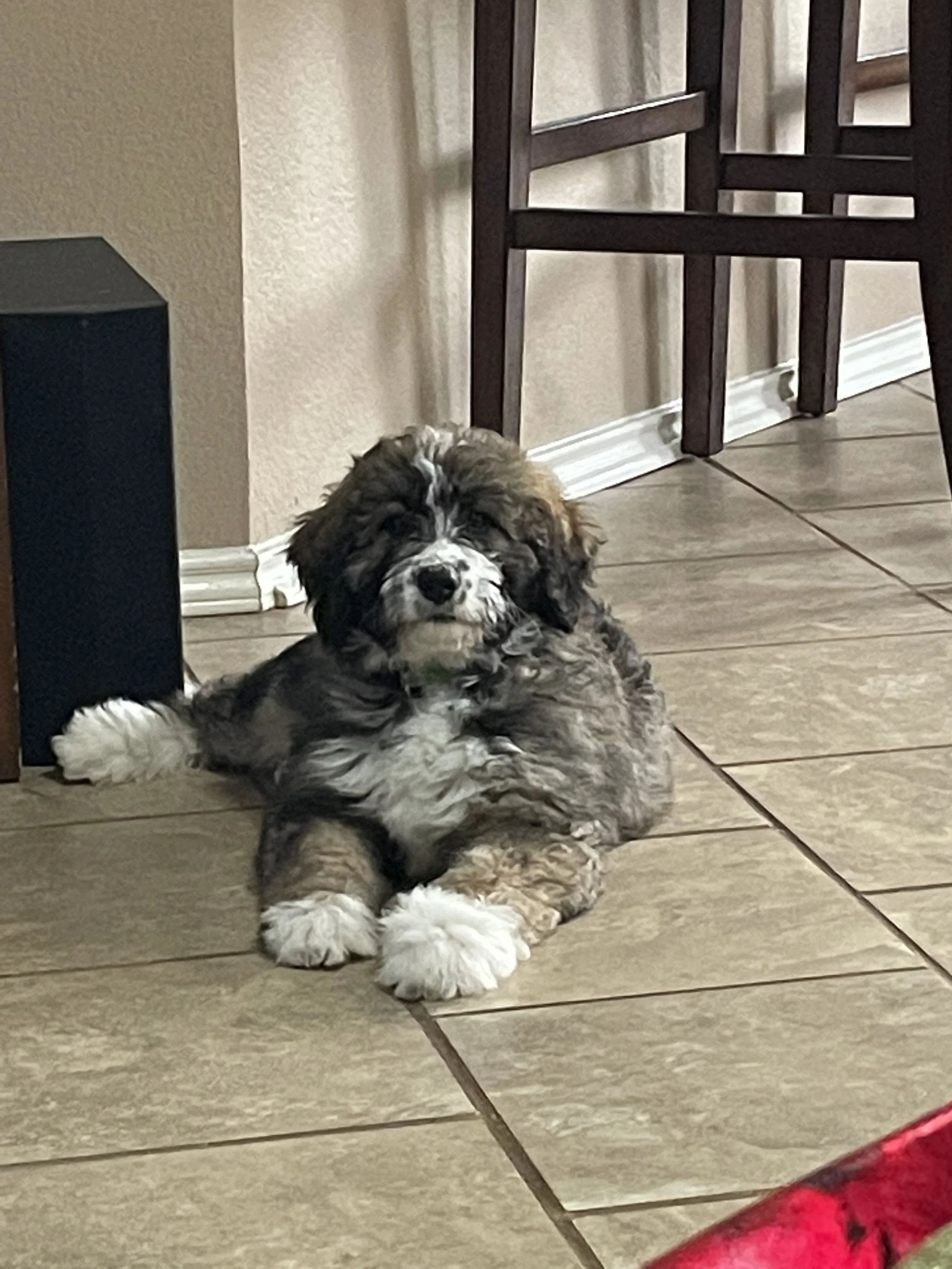 “Maggie has been an amazing addition to our family. As the mom of several doodles and a giant breed dog, she is our first Bernedoodle and has not disappointed. She is so sweet, smart and great around the family and other dogs. Joy does an amazing job of caring for and socializing all of these babies to be perfect family dogs!”